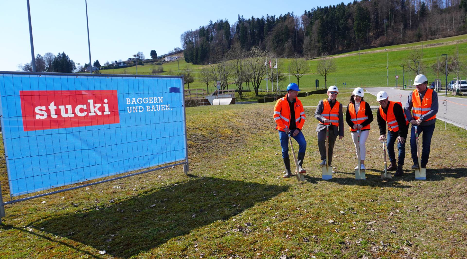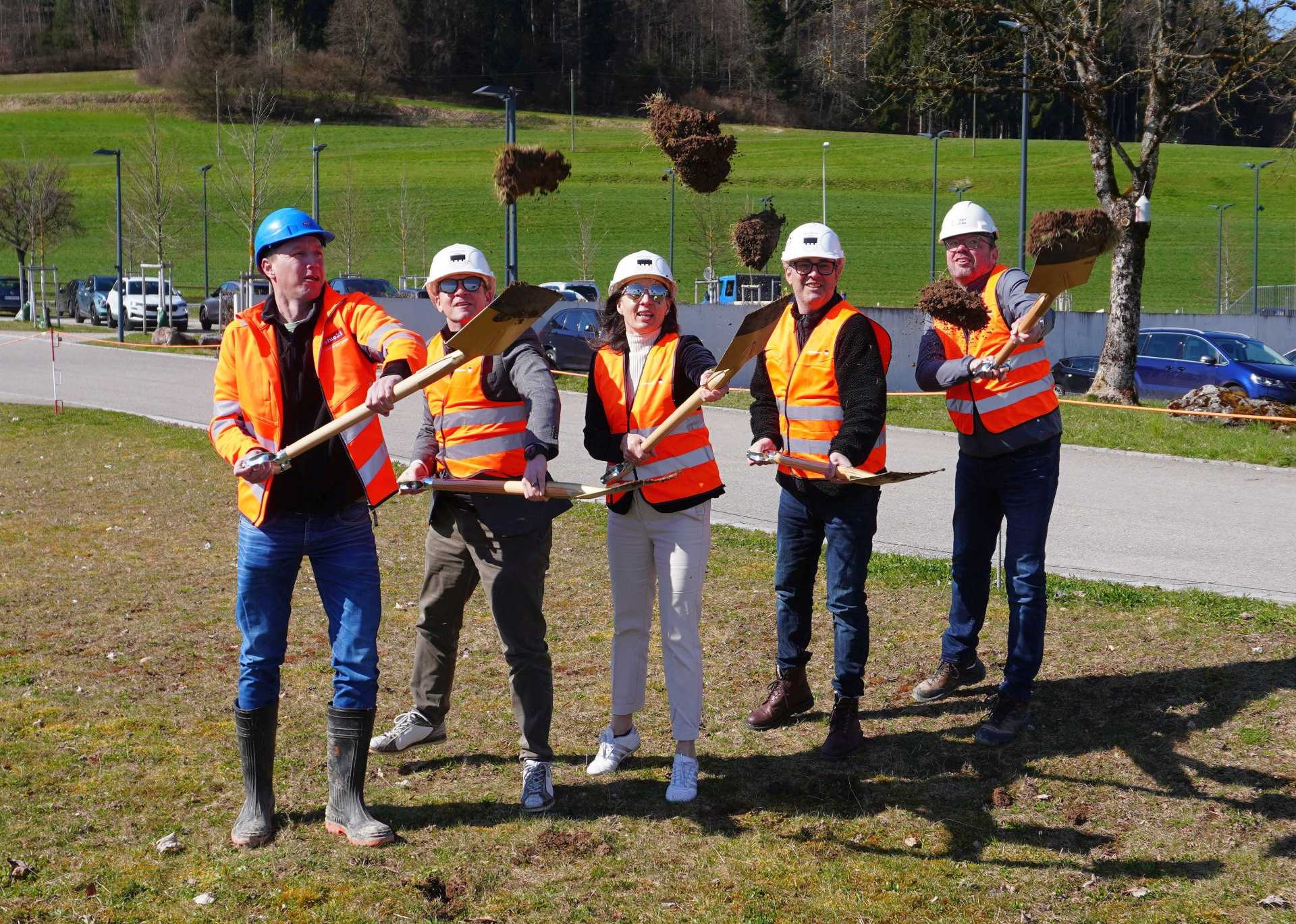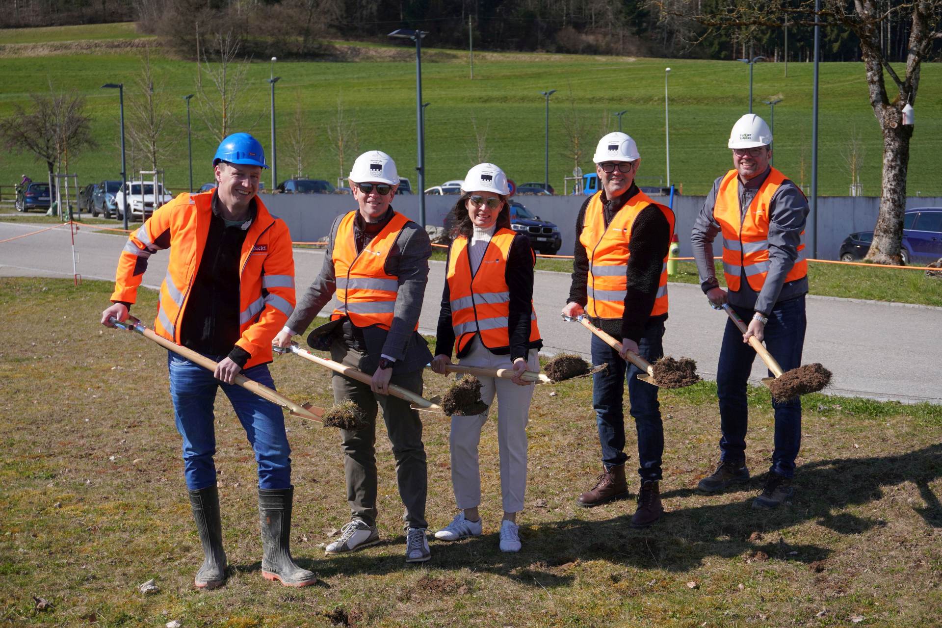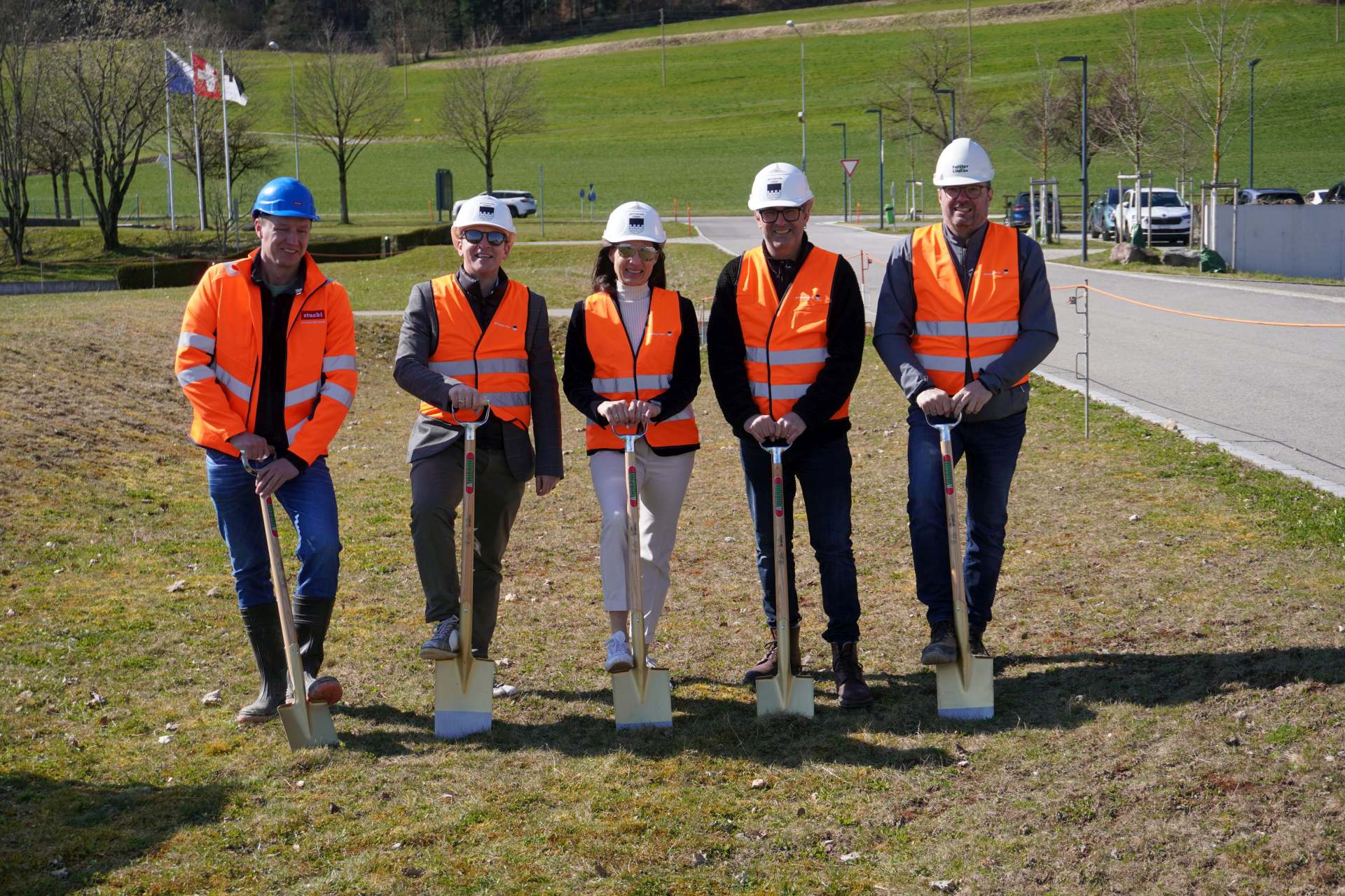 Freuen sich über den Spatenstich (v. l.): Markus Stucki (Stucki AG), Yves Keller (Gemeindepräsident), Catherine Gerwig (Ressortvorsteherin Tiefbau), Ueli Bertschinger (Projektleiter Gemeinde), Markus Rüegg (Forster & Linsi AG)